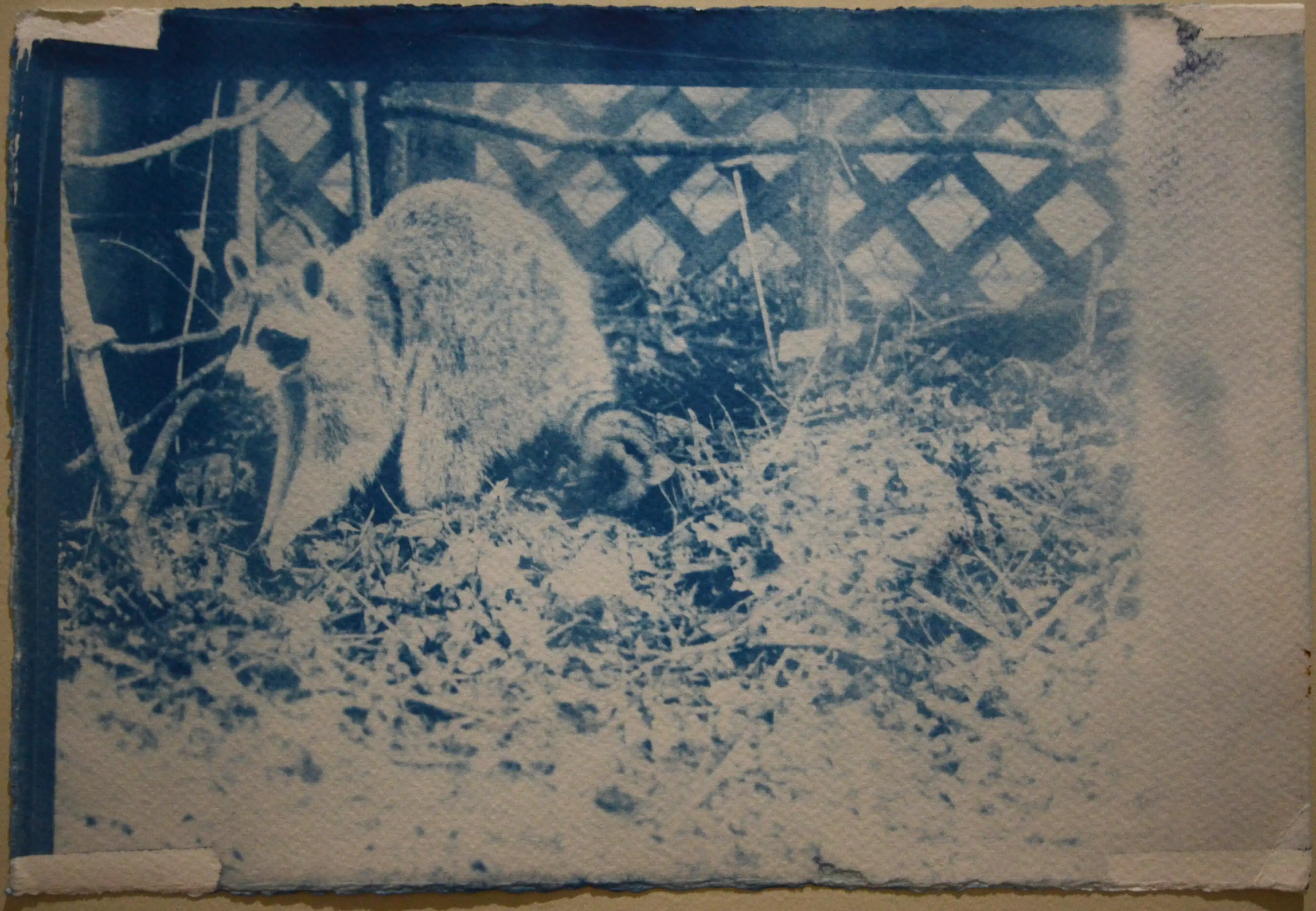 A collection of cyanotype prints made by me. Some prints are plain blueprints, others are toned using coffee or tea. The prints depicted are a mix of vintage artwork and my own photos.